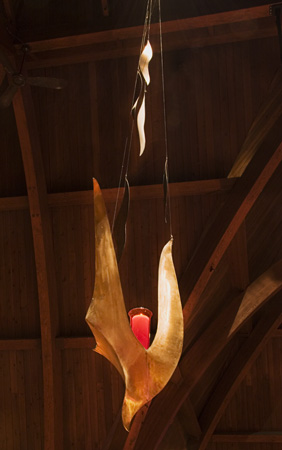 and who cuts out windows for it, paneling it with cedar, and painting it with vermilion.