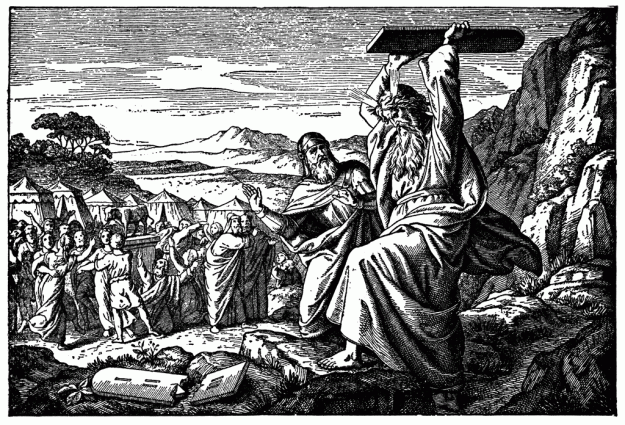 15 Then Moses turned and went down from the mountain, carrying the two tablets of the covenant1 in his hands, tablets that were written on both sides, written on the front and on the back. 16 The tablets were the work of God, and the writing was the writing of God, engraved upon the tablets. 17 When Joshua heard the noise of the people as they shouted, he said to Moses, “There is a noise of war in the camp.” 18 But he said, “It is not the sound made by victors, or the sound made by losers; it is the sound of revelers that I hear.” 19 As soon as he came near the camp and saw the calf and the dancing, Moses’ anger burned hot, and he threw the tablets from his hands and broke them at the foot of the mountain. 20 He took the calf that they had made, burned it with fire, ground it to powder, scattered it on the water, and made the Israelites drink it.