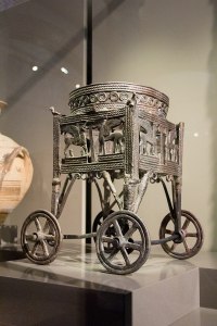 Wheeled stand for a cauldron, bronze, 12-11th century BCE. Probably from Kition, Larnaka district, Cyprus. Currently in the Neues Museum, in Berlin. IN : Misc. 8947.